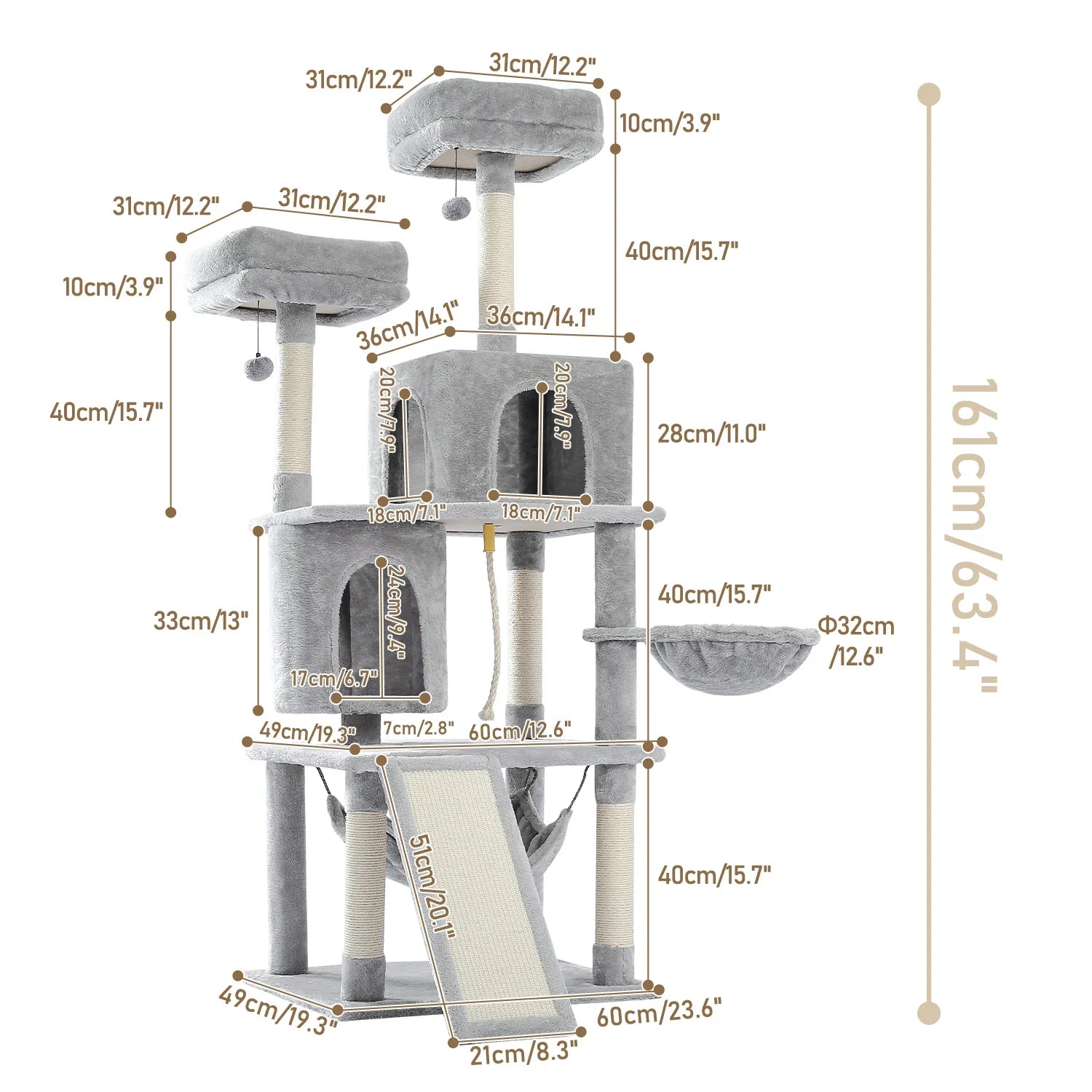 • Dimensions : Hauteur de 165 cm, base de 60 cm x 50 cm, idéal pour les grands chats ou plusieurs chats.